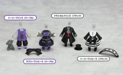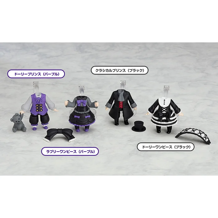From Good Smile Company and sculpted by POLY TOYS and knead comes these Nendoroid More: Dress Up Gothic Lolita outfits for giving your favorite Nendoroids a new, adorable look! This complete box set includes all four Nendoroid bodies dressed up in goth lolita outfits fit for dark princes and princesses (black and white dress with headband, classic black coat coordinate with top hat, black and purple dress with head bow, and purple vest coordinate with dark grey teddy bear). Pop on the heads of your favorite Nendoroids and send them off to a mad tea party! Have more fun with your Nendoroids with this pack of gothic lolita outfits!