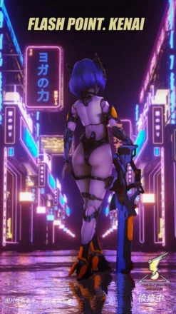 Flash Point introduces the beautiful heroine, Kenai! This blue-haired cyberpunk queen is produced in 1/12 scale and features a fully articulated body so that you can display her in countless poses! Her weapons include an electromagnetic rifle that matches the style of her armor. With six pairs of eyes, four pairs of hand types, and six facial expressions, there’s no end to how you can bring this animated character to life!