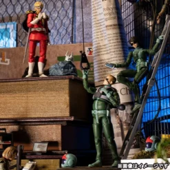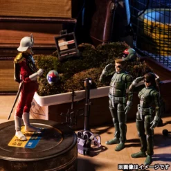 He comes with an interchangeable head part to display him without his helmet, a cup, memo book, six time bombs and a bomb case, a two-piece ladder perfect for infiltration missions, a boulder for him to stand triumphantly on, and interchangeable arm parts. Display him together with