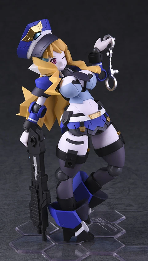 From Daibadi comes this highly articulated figure of Kelly from the visual novel Robot Neoanthropinae Polynian. She has a sleek look and curvy figure. Highlights include the vivid police blue paint of her outfit detailed with metallic gold, her long poseable ponytail, her two optional expressions, and the many included accessories of which one is handcuffs she can actually wear and break out off! Also comes with a police hat and two weapons. She measure 5.1” and stands on a cool transparent hex base.