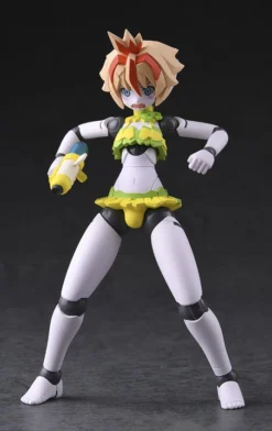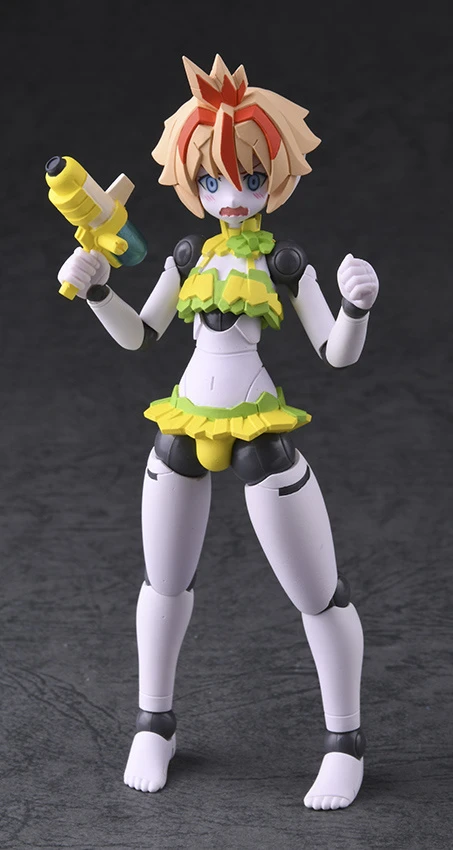 From Daibabi’s Robot Neoanthropinae Polynian line of customizable robot girl action figures comes Rucio in a bikini! The android cutie features a MMM-style body wearing a yellow bikini with cute “frills” and comes with three face plates to display her smiling, smiling with eyes closed, or looking embarrassed. Highly articulated, she also comes with an Energy spray gun and additional hand parts to capture her in fun poses as well as a hexagonal base to display her on. Also included as a bonus part is a new face for